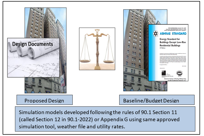 The performance path allows projects to not meet some of the prescriptive requirements and make up for the associated energy penalty by improving over mandatory and prescriptive provisions in other areas. For example, projects with high window to wall ratio may demonstrate compliance by showing that the energy penalty associated with the high thermal loads is offset by savings from an efficient HVAC system and daylighting. The required analysis involves developing two whole building energy simulation models. The first model establishes the point of reference and is referred to as budget (90.1 Energy Cost Budget Method which is also known as Section 11 in 90.1 2016 and 2019 and Section 12 in 90.1 2022) or baseline (90.1 Performance Rating Method which is also known as Appendix G) building design. The second model represents the building design based on the design documents. The compliance outcome is established by comparing the simulated annual energy cost of the two models. This general concept is illustrated in Figure 5.