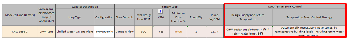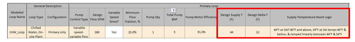 - Use simulation reports to verify that the modeled chilled water loop configuration (i.e. primary/secondary) and temperature controls are modeled as reported in the Compliance Form.