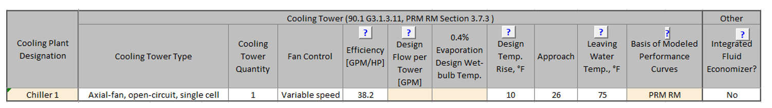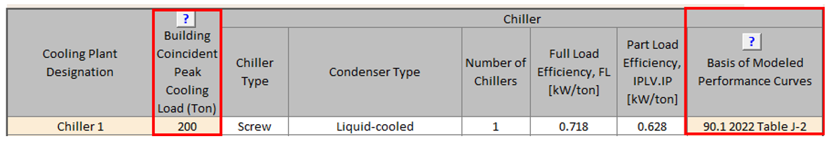 - Baseline chillers are shown in Table 4a on the Baseline HVAC PRM tab. User inputs are limited to the building peak cooling load and the basis of the modeled performance curves. The rest of the fields are auto-populated based on the applicable Appendix G rules and are non-editable.
