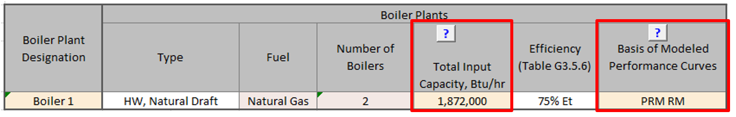 G3.2 New Construction/Major AlterationsTable 11.5.2 – 1/Table 12.5.2 – 1, Note f: The budget building design boiler plant must be modeled with a single boiler if the budget building design plant load is 600,000 Btu/h or less and with two equally sized boilers for plant capacities exceeding 600,000 Btu/h. Boilers must be staged as required by the load. Boilers must use the same fuel as the proposed building design and be natural draft. Boiler efficiency must be the minimum required in 90.1 Table 6.8.1-6. If the proposed design uses purchased hot water or steam, then purchased water or steam must also be used in the budget design in lieu of boilers and the hot-water or steam costs must be based on actual utility rates.