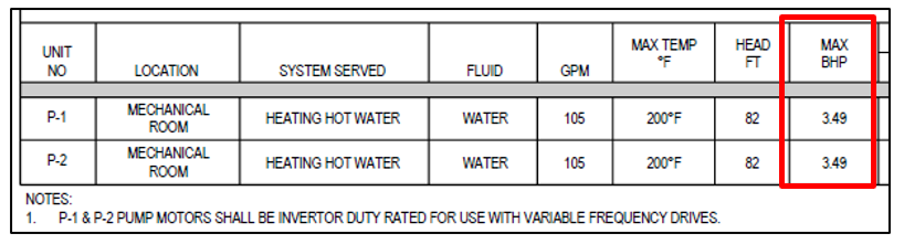 - Review simulation reports to verify that hot water pumps were modeled as reported in the Compliance form including pump design flow (GPM), power (kW, or BHP and motor efficiency) and flow control (one/two speed, VSD).