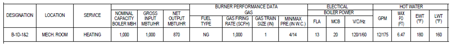 Section G3.1.3.2: The boiler plant for baseline System 1, 5 and 7 must be natural draft and use natural gas. If natural gas is not available on-site as determined by AHJ, the boiler plant must use propane. Purchased heat must be modeled in the baseline instead of on-site boiler for projects that use purchased heat in the proposed design (Section G3.1.1.1). The on-site baseline boiler plant must be modeled with a single boiler if the baseline plant serves a conditioned floor area of 15,000 ft2 or less and with two equally sized boilers for plants serving more than 15,000 ft2 . The boilers must be staged as required by the load.