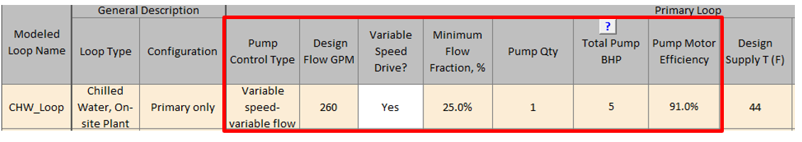 Details of the specified CHW pumps are reported in Table 5a of the Proposed HVAC tab. Verify