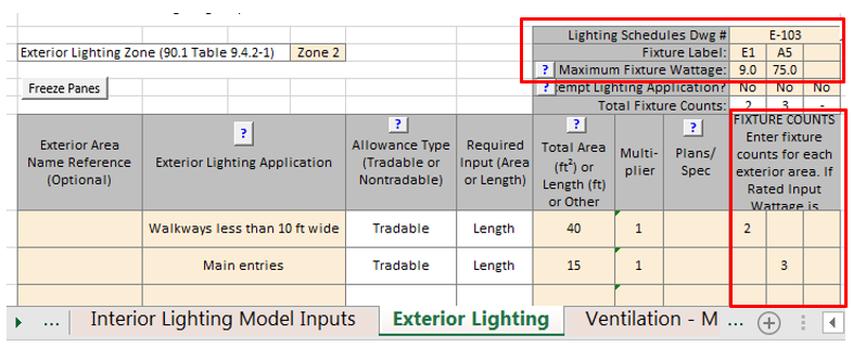 - Use Table 1 of the Exterior Lighting tab to identify lighting fixtures that contribute the most toward the total specified lighting wattage based on the product of the Maximum Rated Fixture Wattage and Total Fixture Counts. Refer to the Lighting Schedule drawings to establish the manufacture and model number for the fixtures. Check the manufacturer information to confirm that the maximum rated fixture wattage reported in the compliance form reflects manufacturer’s data.