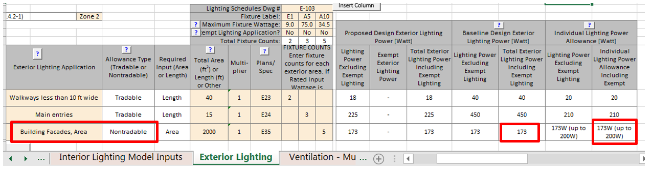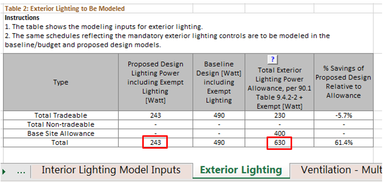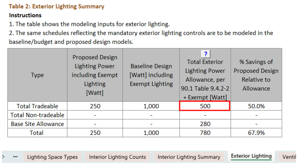 - Baseline/budget exterior lighting wattage is shown in Table 1 of the Exterior Lighting tab. It