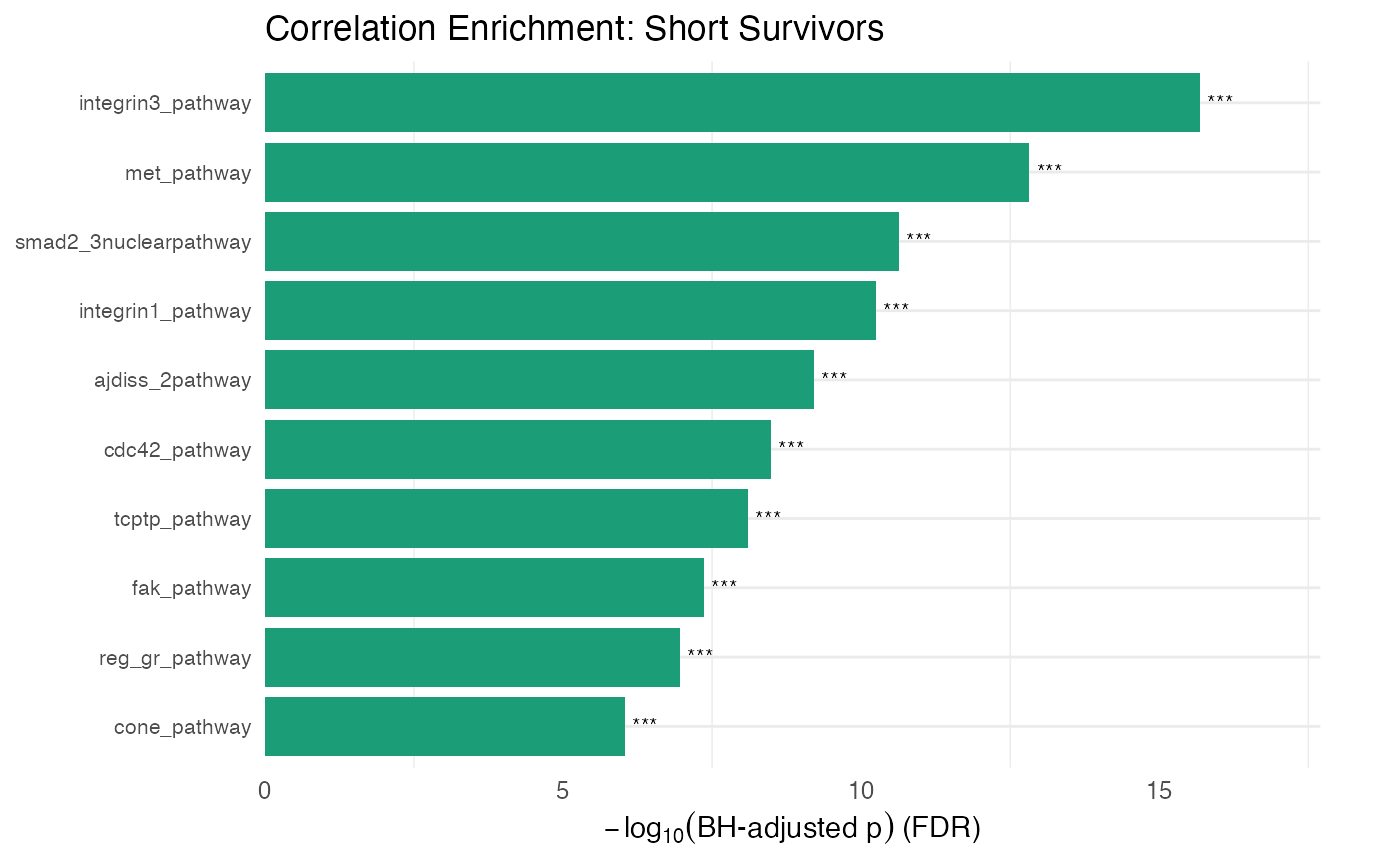 The background of comparison for functional enrichment is always important, but it mainly impacts the Fisher’s exact tests in the examples below. The background answers the question: “My functional group of interest is statistically enriched relative to what?” For Fisher’s exact tests this is critical. Generally, it is best to compare enrichment against the components observed in the data (the experiment’s universe) rather than the universe of all possible components. For example, a proteomics dataset from plasma may contain a limited set of proteins compared with all possible human proteins; using the observed proteins as the background usually yields more meaningful results. Using all possible proteins will result in substantially different findings.