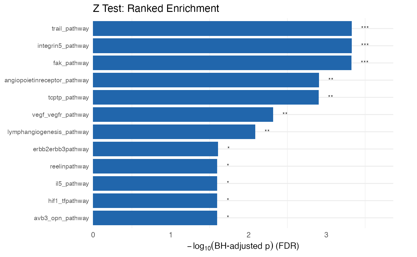 The overall idea for functional enrichment is to determine which pathways are statistically over-represented in one group versus another, display statistically differential abundance from one group to another, or are statistically differentially distributed in a ranked list based on the abundance of one sample. Each of these purposes has a different underlying statistical test (or family of tests) and the results of each can be interpreted in somewhat different ways. The purpose of this vignette is to give the user a very brief introduction on how to use the package, not to discuss the underlying statistical choices that need to be made when analyzing such data.