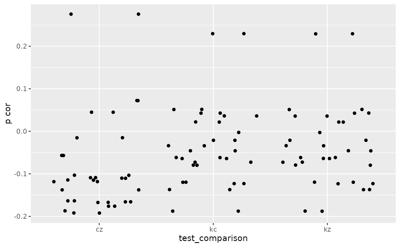 ggplot(aes(x=test_comparison, y= `p cor`)) + geom_jitter()